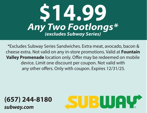 *Excludes Subway Series Sandwiches. Extra meat, avocado, bacon & cheese extra. Not valid on any in-store promotions. Valid at Fountain Valley Promenade location only. Offer may be redeemed on mobile device. Limit one discount per coupon. Not valid with any other offers. Only with coupon. Expires 12/31/25.